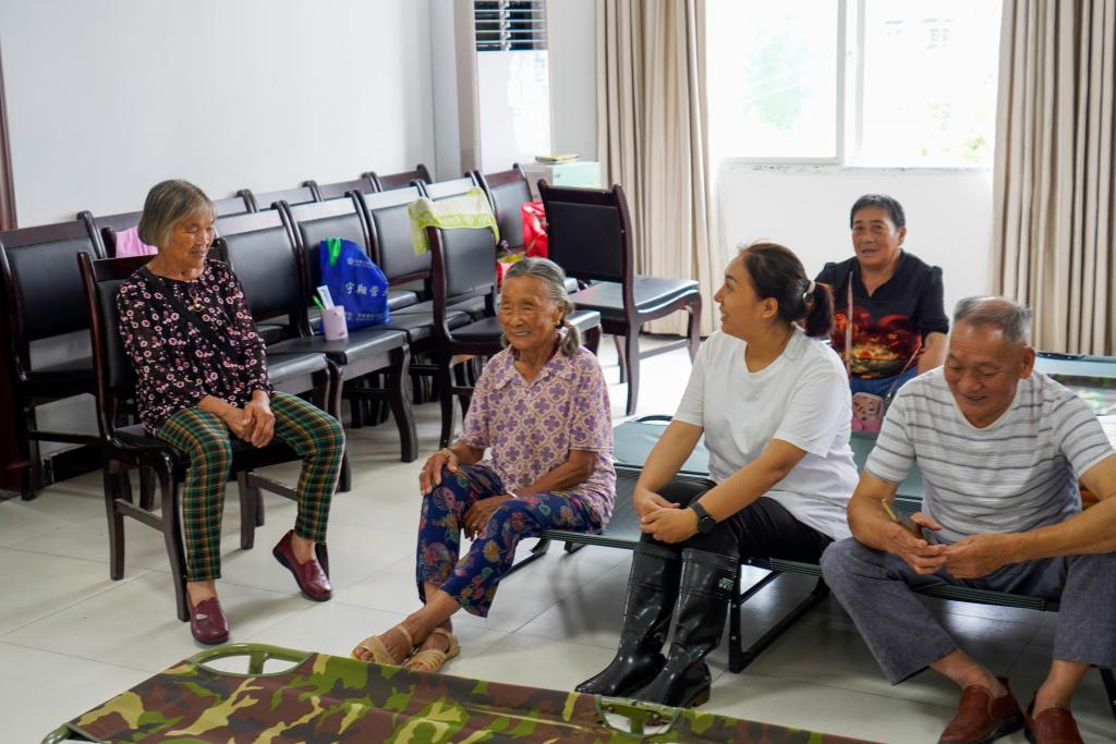 7月30日,富強村村委會辦公點內(nèi),村黨支部書記謝小紅(右二)和被安置的群眾聊天,了解他們的困難和需求。新華社記者 劉潺 攝