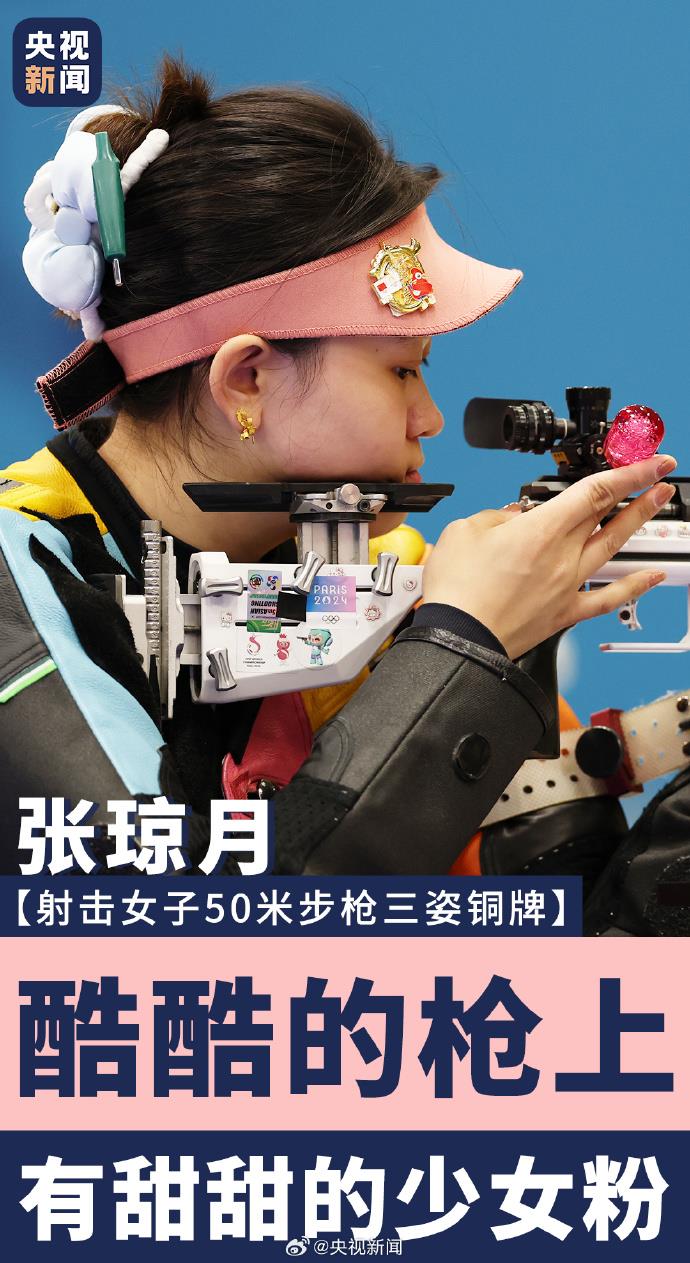 8月2日,在巴黎奧運(yùn)會(huì)射擊女子50米步槍三姿決賽中,中國選手張瓊月奪得銅牌。戴著粉色帽子的張瓊月,步槍上貼滿可愛的Hello Kitty貼紙,用最萌的裝備打最穩(wěn)的槍!