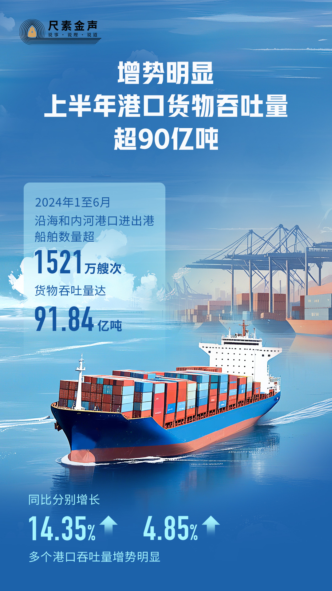 港口,貨物進(jìn)出口的重要門戶;港口貨物吞吐量,國民經(jīng)濟(jì)發(fā)展的“晴雨表”。日前,中國港口運(yùn)行“半年報”公布:今年1至6月,沿海和內(nèi)河港口進(jìn)出港船舶數(shù)量超1521萬艘次,貨物吞吐量達(dá)91.84億噸,同比分別增長14.35%、4.85%,多個港口吞吐量增勢明顯。