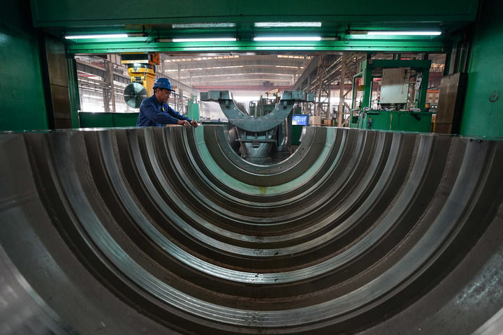 工人在位于黑龍江省齊齊哈爾市的中國(guó)一重集團(tuán)有限公司生產(chǎn)車(chē)間運(yùn)送產(chǎn)品(2024年3月5日攝)。