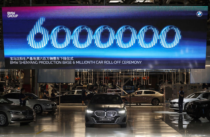 在寶馬沈陽(yáng)生產(chǎn)基地拍攝的華晨寶馬第600萬(wàn)輛整車(chē)下線(xiàn)儀式(2024年5月8日攝)。