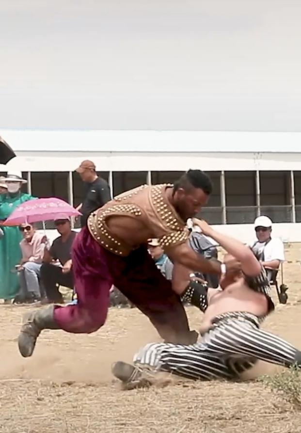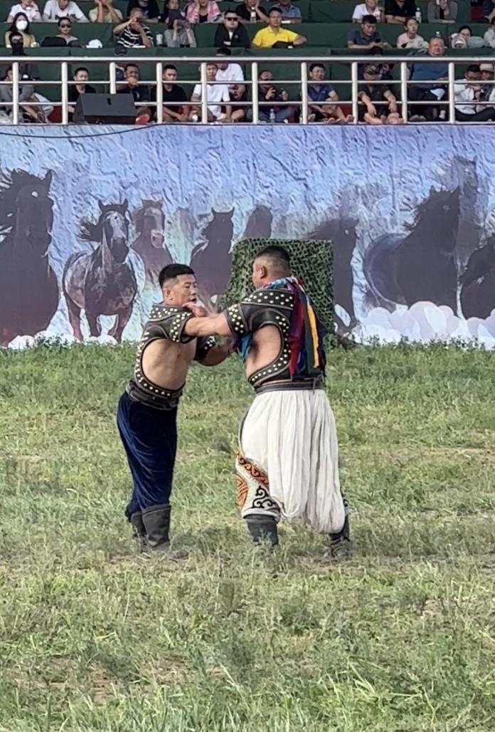 阿斯琴:包括腰力、轉(zhuǎn)動能力和手臂的力量。(牧民的傳統(tǒng))馴馬、馴牛、馴駱駝,不能用蠻力,要有巧勁,要有這方面的天賦才行。比賽規(guī)則就是單排淘汰,倒了就不能再上了。一跤定勝負(fù),這是它摔跤的特點(diǎn)。