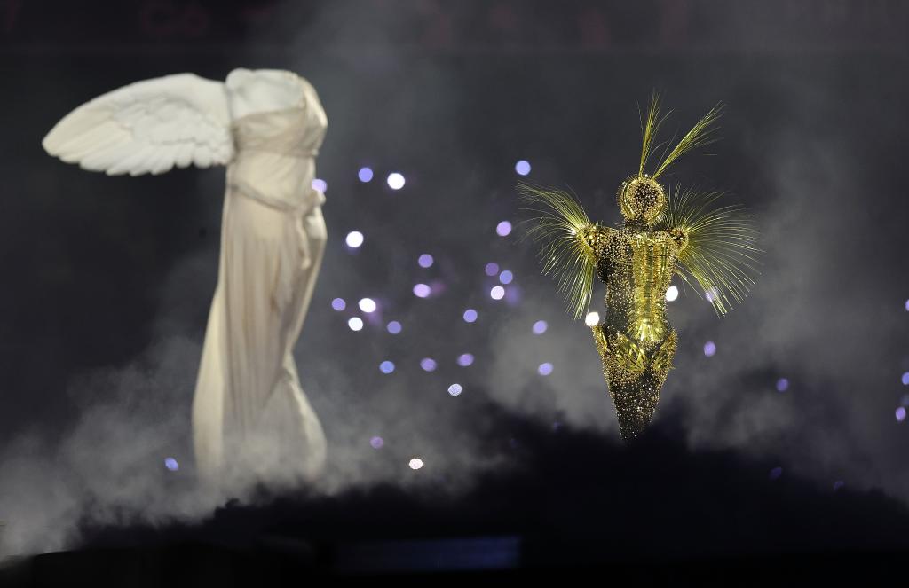 夜幕降臨,法蘭西體育場(chǎng)進(jìn)入另一個(gè)時(shí)空——一個(gè)奧運(yùn)會(huì)消失的世界。金色旅行者從天而降,隨著他的腳步,人們踏上一場(chǎng)夢(mèng)幻般的探索。希臘國(guó)旗、奧運(yùn)五環(huán)……與奧林匹克相關(guān)的遺跡逐漸被發(fā)掘。