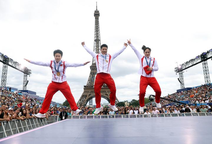 8月9日,中國(guó)舉重選手侯志慧(左)、李發(fā)彬(中)和羅詩(shī)芳在冠軍公園慶祝。當(dāng)日,觀眾來到位于法國(guó)巴黎特羅卡德羅廣場(chǎng)的冠軍公園,與奧運(yùn)獎(jiǎng)牌獲得者分享榮耀。新華社記者 雒圓 攝