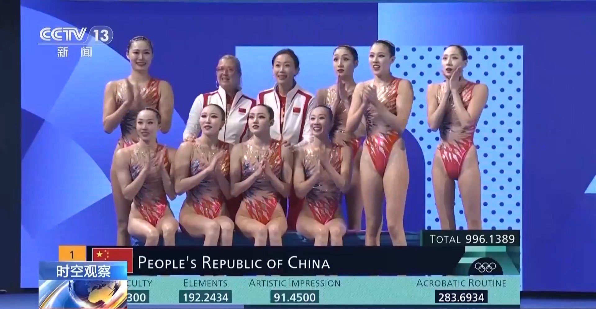996.1389分!中國花游姑娘們以三場比賽穩(wěn)居第一的優(yōu)異表現,贏得了中國花游在奧運會上奪得的首枚金牌。