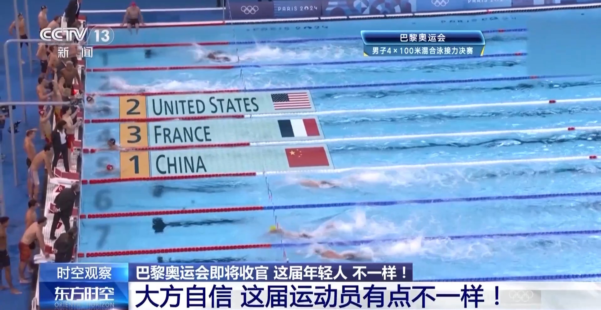 巴黎奧運會游泳賽場最后一個比賽日,中國隊放了個大招。男子4X100米混合泳接力決賽上,中國隊力壓該項目40年“霸主”美國隊,以3分27秒46的成績奪冠。