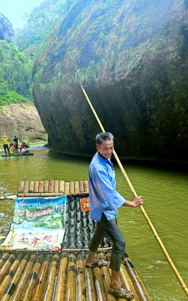 “我們一趟就要撐萬把下竹竿,一年下來要撐三百多萬下?!备闪?5年的上清溪排工黃盛騰談起他的排工生活,幽默風(fēng)趣,“上清溪全長16.5公里,落差比較大,排走得比較緩慢一些,那就比較吃力一些,所以說我們的工人叫‘吃飽了撐著’?!?/p>
