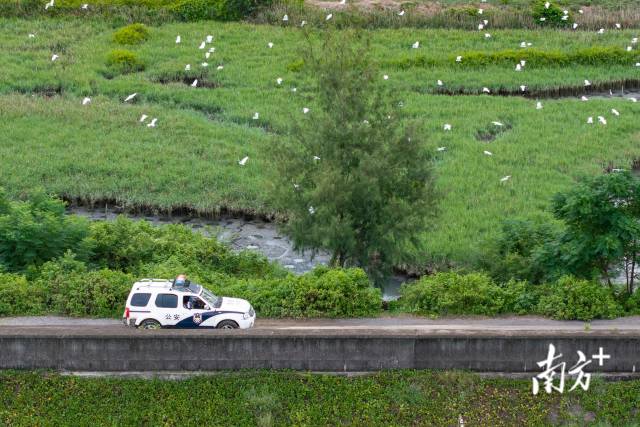 派出所的警車駛過一片紅樹林,成群的鷺鳥跟著警車在空中飛翔。