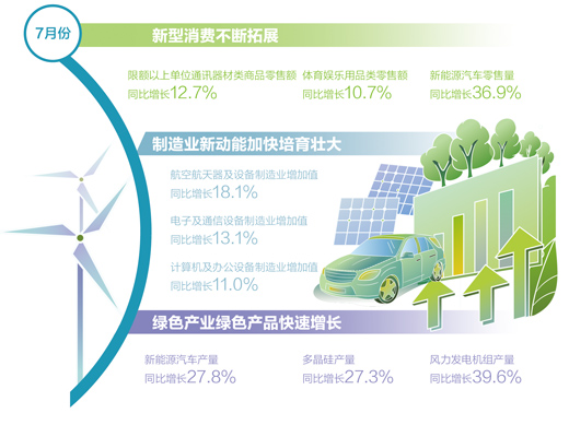 傳統(tǒng)產(chǎn)業(yè)轉(zhuǎn)型升級穩(wěn)步推進,新興產(chǎn)業(yè)快速發(fā)展,產(chǎn)業(yè)提質(zhì)升級為經(jīng)濟發(fā)展增添了新動力和新優(yōu)勢。1至7月,規(guī)模以上高技術制造業(yè)、裝備制造業(yè)增加值占比同比分別提高0.6和0.9個百分點;虛擬現(xiàn)實設備、新能源汽車等智能綠色產(chǎn)品都保持兩位數(shù)以上增長,經(jīng)濟新的增長點逐步形成,有利于增強經(jīng)濟上行動力。