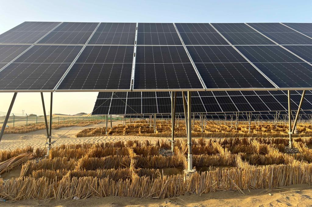 從新疆庫爾勒市出發(fā),沿著烏若高速向東南方向駛?cè)搿八劳鲋!薄死敻缮衬沟?,寫著“沙戈荒光伏生態(tài)治沙示范項目”大字的一座光伏電站映入眼簾。光伏板下及光伏電站外圍,青黃色的蘆葦稈扎入沙中構(gòu)成“圍棋盤”式的草方格,將黃沙牢牢包圍。