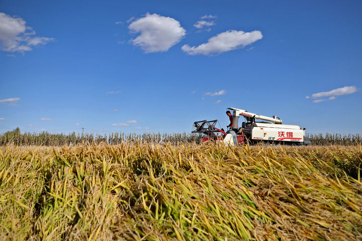 農(nóng)業(yè)機(jī)械在遼寧盤錦市遼河三角洲尤巧元家庭農(nóng)場(chǎng)的稻田里收割水稻(2023年10月20日攝)。新華社記者 姚劍鋒 攝