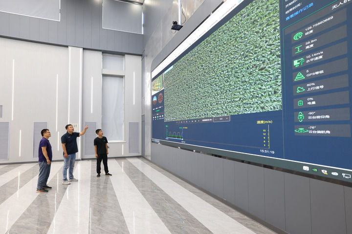 在黑龍江北大荒集團(tuán)趙光農(nóng)場(chǎng)有限公司科技服務(wù)中心,農(nóng)業(yè)科技人員通過田間物聯(lián)網(wǎng)系統(tǒng)在數(shù)字農(nóng)業(yè)指揮大廳實(shí)時(shí)觀看智能無人機(jī)回傳的視頻,及時(shí)查看田間作物長(zhǎng)勢(shì)情況(2024年7月22日攝)。新華社發(fā)(錢泊羽攝)