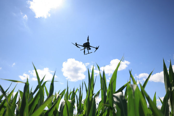 在黑龍江北大荒集團(tuán)趙光農(nóng)場(chǎng)有限公司農(nóng)業(yè)科技園區(qū),一臺(tái)智能無人機(jī)按照規(guī)定時(shí)間、規(guī)定路線進(jìn)行自動(dòng)巡田作業(yè)(2024年7月22日攝)。新華社發(fā)(錢泊羽攝)