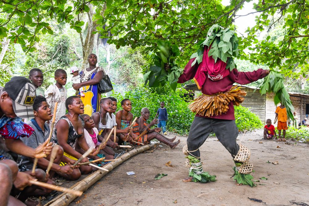 7月11日,在喀麥隆南部大區(qū)克里比市,恩杜馬萊村的俾格米人村民舉行慶?;顒印P氯A社發(fā)(科普索攝)