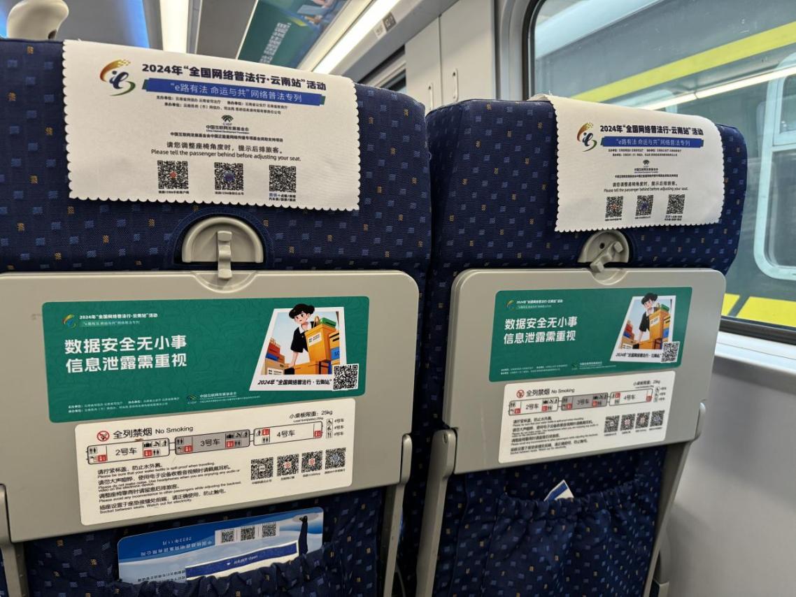 據(jù)介紹,專列的8個(gè)主題車廂分別以“中國(guó)網(wǎng)絡(luò)法治三十年”“網(wǎng)絡(luò)安全”“數(shù)據(jù)安全”“未成年人網(wǎng)絡(luò)保護(hù)”“數(shù)據(jù)出境之旅”“反網(wǎng)暴凈網(wǎng)行動(dòng)”“個(gè)人信息守護(hù)”以及“網(wǎng)絡(luò)空間命運(yùn)共同體”命名,通過(guò)鏡框海報(bào)、玻璃貼、小桌板貼、行李架彩貼、頭枕片、車內(nèi)LED信息屏等形式多樣的載體,全面展示網(wǎng)絡(luò)法治30年成就、網(wǎng)絡(luò)空間命運(yùn)共同體主張。讓乘客們?cè)谙硎苁孢m旅途的同時(shí),也能輕松學(xué)習(xí)到實(shí)用的法律信息。