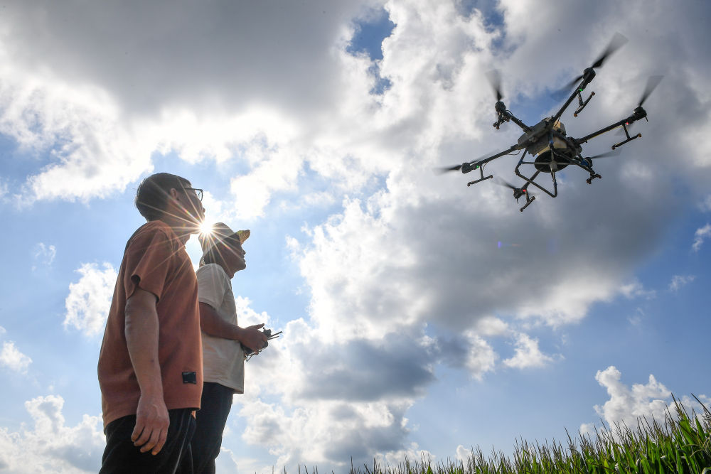 2024年8月8日,在吉林省梨樹縣孤家子鎮(zhèn),當(dāng)?shù)剞r(nóng)業(yè)發(fā)展服務(wù)站高級農(nóng)藝師蘭雨壯(左)查看無人機(jī)作業(yè)情況。