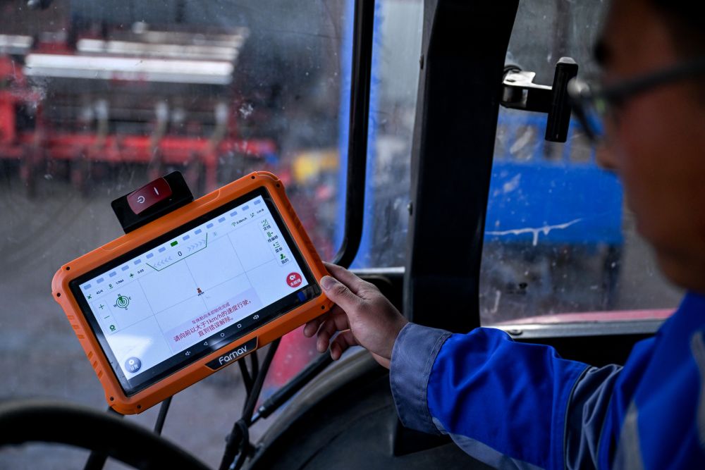 2024年3月13日,黑龍江北大荒(佳木斯)精準(zhǔn)農(nóng)業(yè)科技有限公司工作人員測試北斗自動駕駛儀產(chǎn)品。