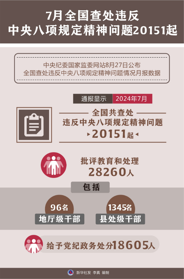 中央紀委國家監(jiān)委網(wǎng)站27日公布全國查處違反中央八項規(guī)定精神問題情況月報數(shù)據(jù)。通報顯示,今年7月,全國共查處違反中央八項規(guī)定精神問題20151起,批評教育和處理28260人(包括96名地廳級干部、1345名縣處級干部),給予黨紀政務(wù)處分18605人。
