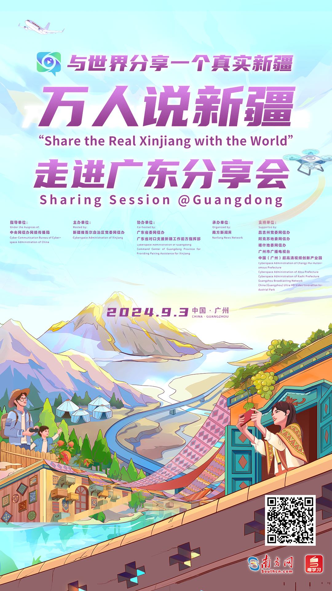 在交流互鑒中把新疆溫柔地說與全世界,在新粵兩地合作中感悟跨“粵”千里的援疆故事?!叭f人說新疆”走進(jìn)廣東分享會(huì)將于9月2日至3日在廣州舉行。此次活動(dòng)由新疆維吾爾自治區(qū)黨委網(wǎng)信辦主辦,廣東省委網(wǎng)信辦、廣東省對(duì)口支援新疆工作前方指揮部協(xié)辦,南方新聞網(wǎng)承辦。分享會(huì)從國(guó)內(nèi)知名學(xué)者、外籍專家、海內(nèi)外博主、援疆干部、港澳青年等不同視角,講述有溫度、有情懷、接地氣的美好新疆故事。