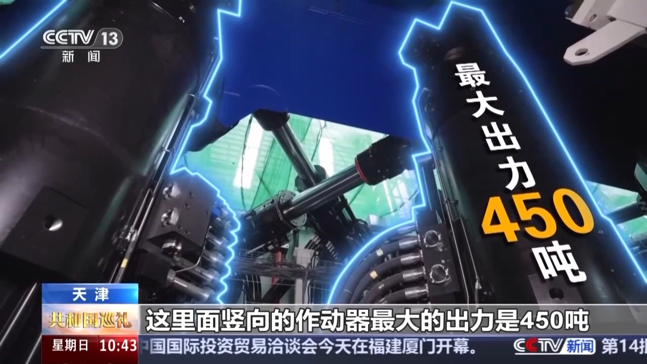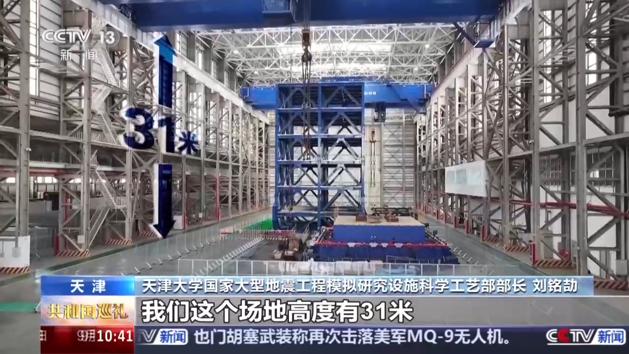 天津大學(xué)國(guó)家大型地震工程模擬研究設(shè)施科學(xué)工藝部部長(zhǎng) 劉銘劼:我們這個(gè)場(chǎng)地高度有31米,跨度有43米,這部分區(qū)域的長(zhǎng)度是120米。我們這個(gè)振動(dòng)臺(tái)臺(tái)面尺寸20米乘16米,最大載重1350噸,大概是二十多輛重載卡車的重量。我們?cè)跐M載情況下可以運(yùn)行的最大加速度是2.0個(gè)重力加速度。這么大的加速度實(shí)際上已經(jīng)超過了我們9度烈度條件下的地震動(dòng)的水平。