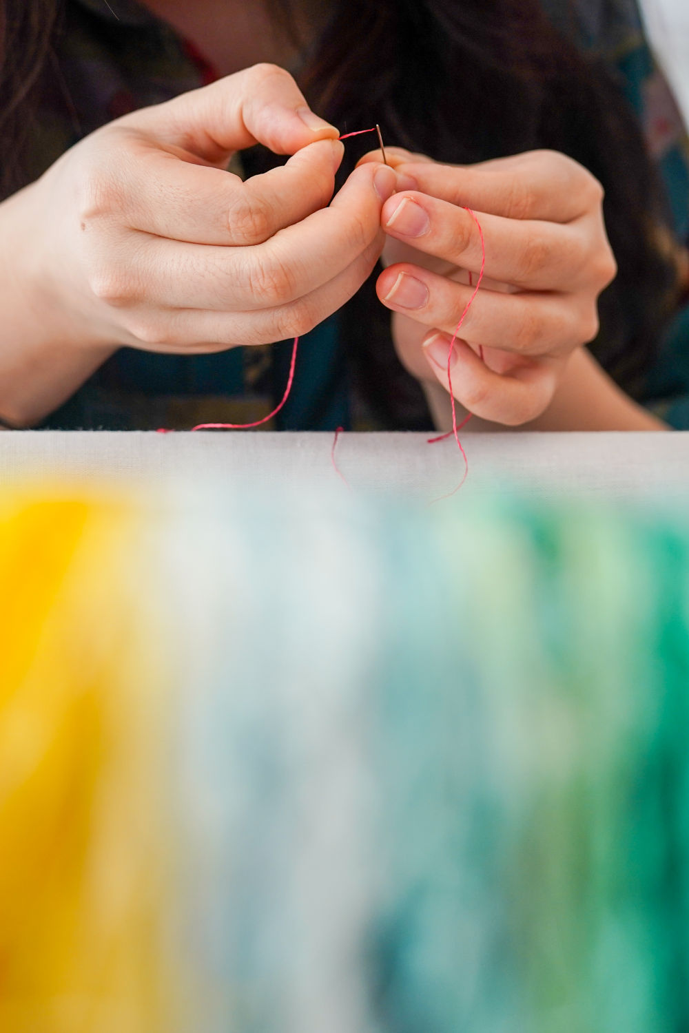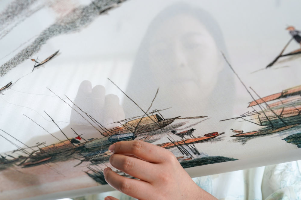 在蘇州高新區(qū)蘇繡小鎮(zhèn)的一家蘇繡公司,一位繡娘在穿針,準備加工蘇繡產品(7月3日攝)。