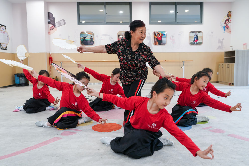 在江蘇蘇州昆山市石牌中心小學?!傲暶罉恰钡挠柧毞績?,昆曲老師吳美玉(中)帶著小昆班的學員們進行扇舞訓練(5月30日攝)。