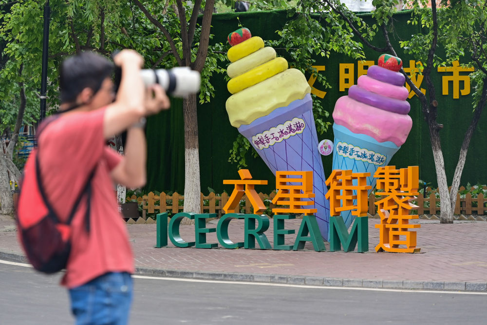 在新疆伊犁哈薩克自治州伊寧市六星街,游客品嘗手工冰淇淋。新華社記者 丁磊 攝