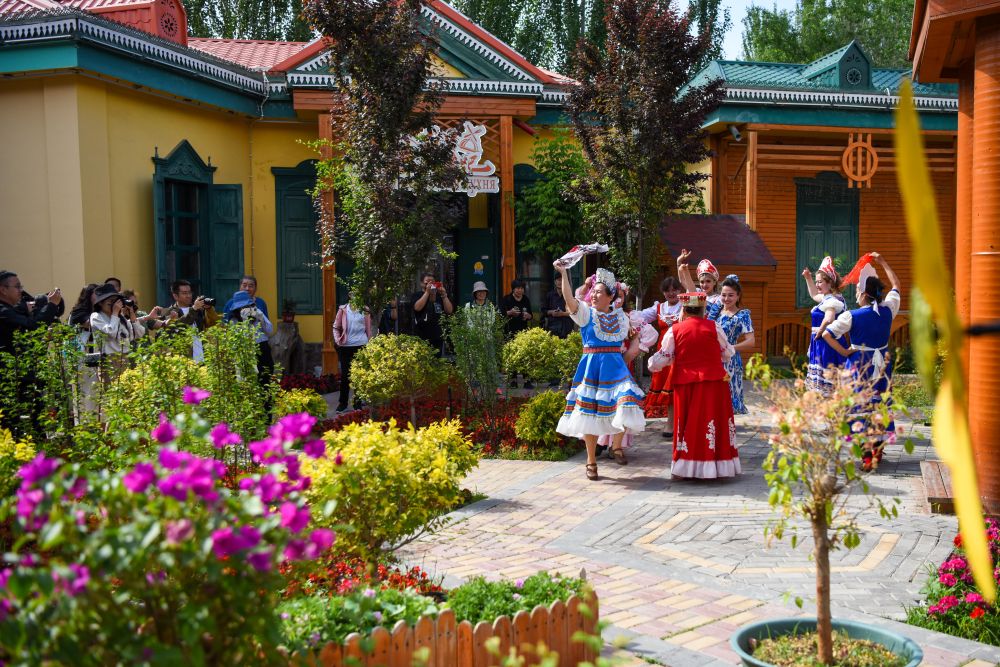 在新疆伊犁哈薩克自治州伊寧市六星街,當(dāng)?shù)鼐用裉鹞璧笟g迎遠(yuǎn)方來客。新華社記者 丁磊 攝
