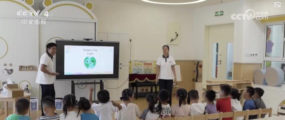 在雄安白塔幼兒園里,美國外教佩雷斯正在教孩子們?nèi)绾芜M(jìn)行垃圾分類。