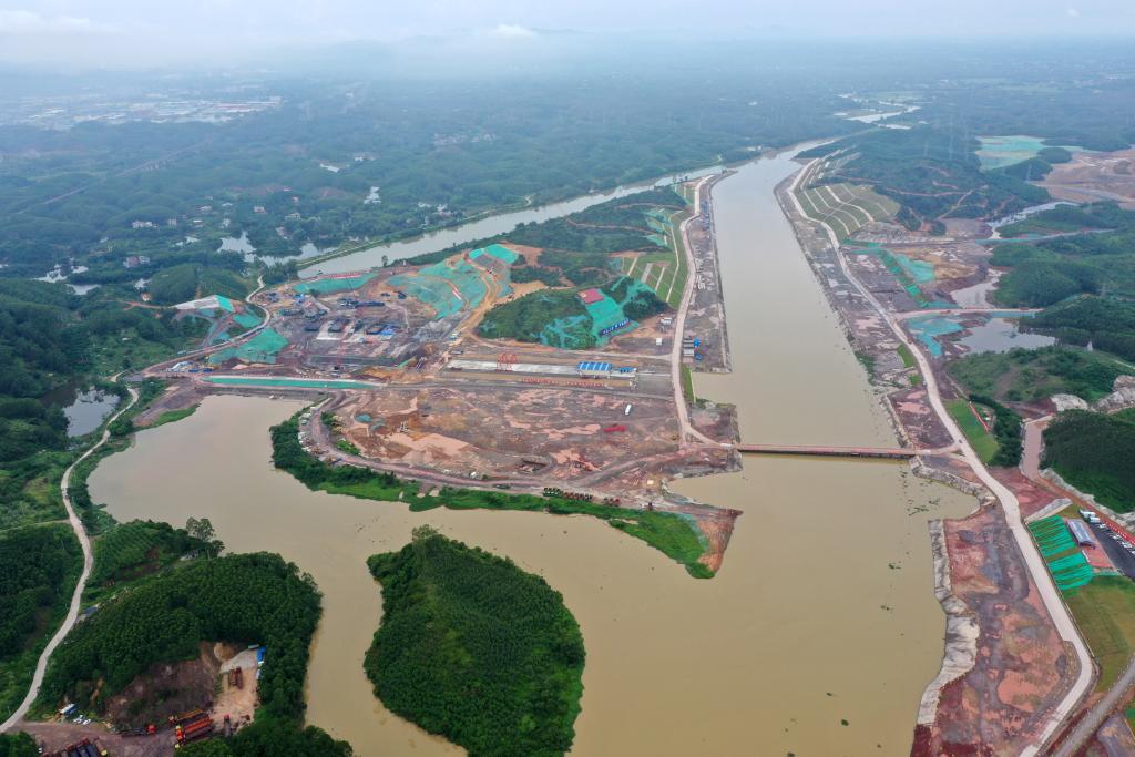 這是施工建設(shè)中的廣西平陸運河青年樞紐(2023年8月1日攝,無人機照片)。新華社記者 陸波岸 攝