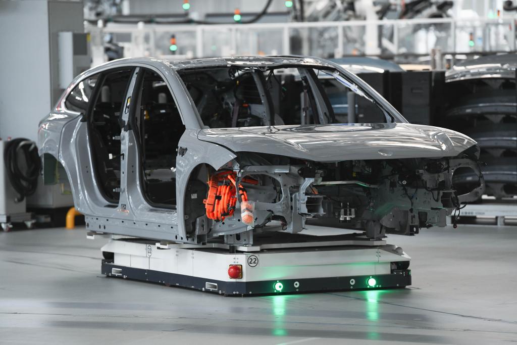 這是在安徽省合肥市新橋智能電動(dòng)汽車產(chǎn)業(yè)園蔚來(lái)第二工廠拍攝的新能源汽車生產(chǎn)線(2024年5月9日攝)。新華社記者 張端 攝