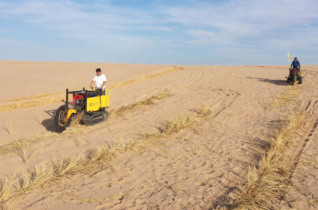 6月16日,內(nèi)蒙古巴彥淖爾市烏拉特后旗西補(bǔ)隆林業(yè)管護(hù)中心職工駕駛機(jī)械壓沙障。新華社記者 李云平 攝