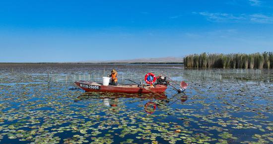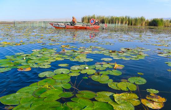 金秋時(shí)節(jié),位于新疆維吾爾自治區(qū)巴音郭楞蒙古自治州博湖縣境內(nèi)的博斯騰湖的螃蟹迎來豐收季,波光粼粼的湖面上,穿梭的漁船與蘆葦、睡蓮、沙漠構(gòu)成一幅生動(dòng)的秋日畫卷。
