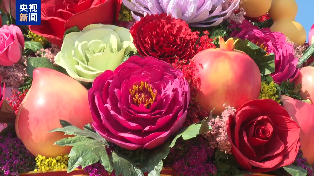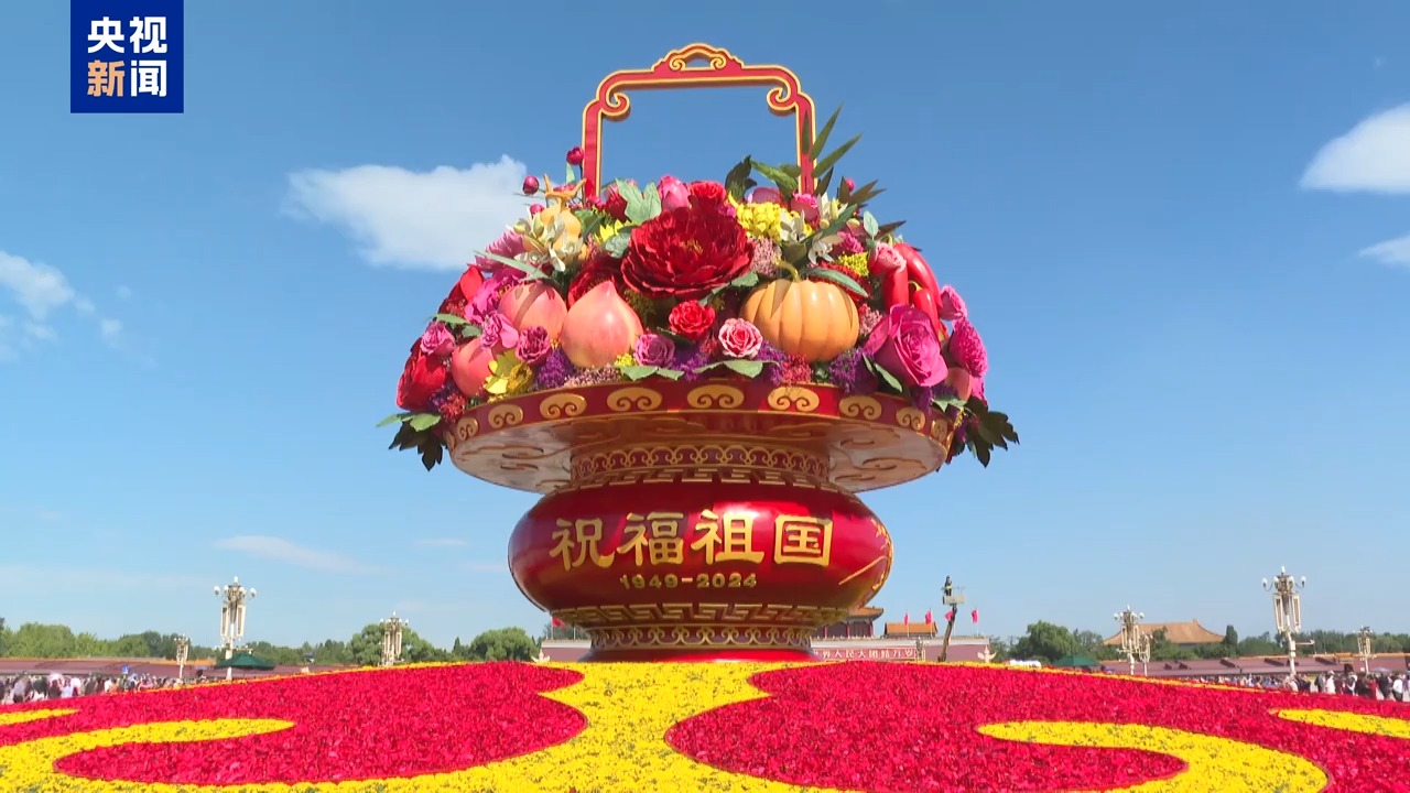 “祝福祖國(guó)”大型花壇以喜慶的蔬果花籃為主景,花壇頂高18米,籃體高16米,籃盤(pán)直徑12米。花壇底部直徑45米,為如意圖案,寓意吉祥如意、國(guó)泰民安。今年的花壇首次以“蔬果花籃”呈現(xiàn),籃內(nèi)選取了美好寓意的蔬果和花卉,體現(xiàn)“蔬果飄香,繁花似錦”。