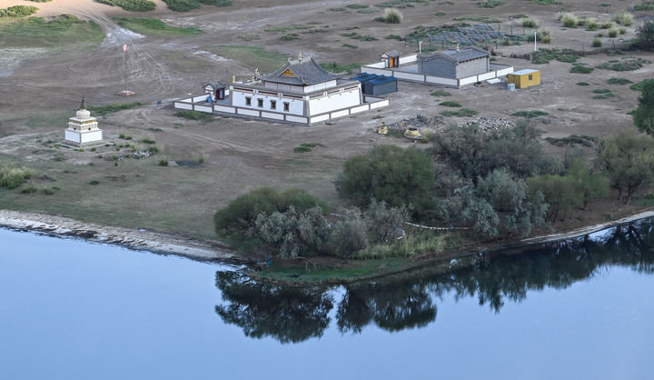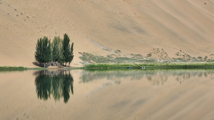 驅(qū)車(chē)深入巴丹吉林沙漠,翻過(guò)數(shù)不盡的沙丘,來(lái)到水草豐美的廟海子。這里四面環(huán)沙山,一座200多年前的白墻金頂寺廟坐落在湖邊,為雄渾壯闊的自然景象抹上一筆濃厚人文氣息。觀者無(wú)不感嘆,當(dāng)年交通不便,如何在沙漠腹地建成如此精美的建筑。