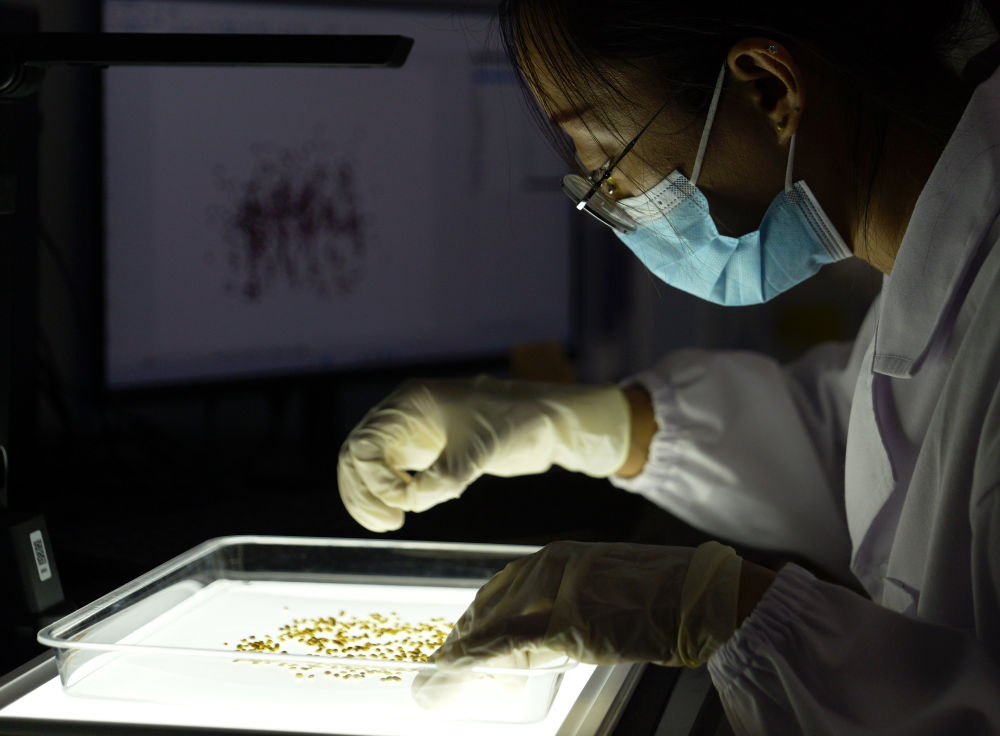 5月16日,中國農(nóng)科院中原研究中心科研人員在中原農(nóng)谷實(shí)驗(yàn)室內(nèi)進(jìn)行高粱樣品篩選。新華社記者 李嘉南 攝