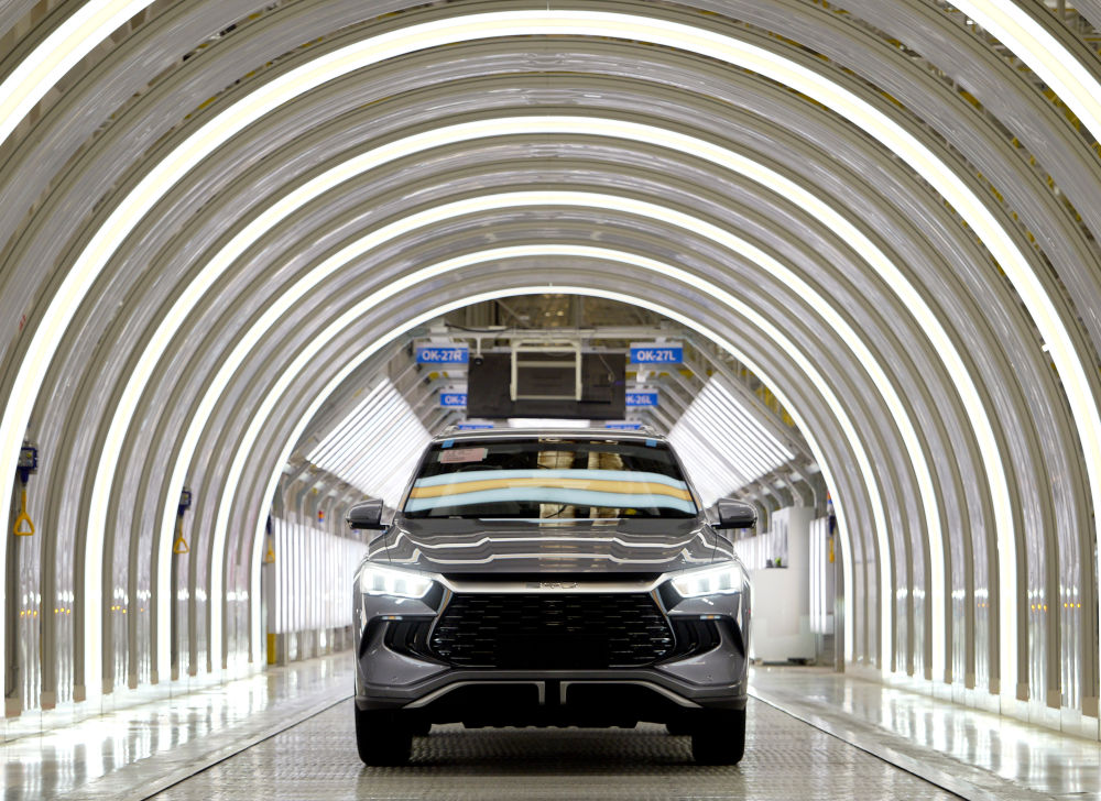 4月25日拍攝的鄭州航空港區(qū)比亞迪總裝工廠新能源汽車“宋Pro”生產(chǎn)線。新華社記者 李嘉南 攝
