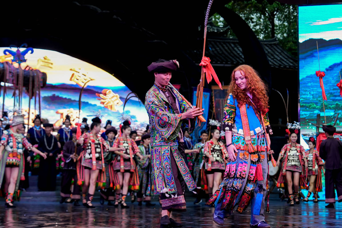 9月16日,美國(guó)青年學(xué)生在貴州省西江千戶苗寨體驗(yàn)民族歌舞。(圖片來源:新華社)