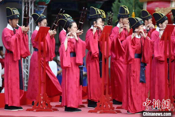 9月28日,臺(tái)北市各界紀(jì)念大成至圣先師孔子誕辰釋奠典禮在臺(tái)北孔廟舉行。圖為樂(lè)生在演奏中。中新社記者 陳小愿 攝