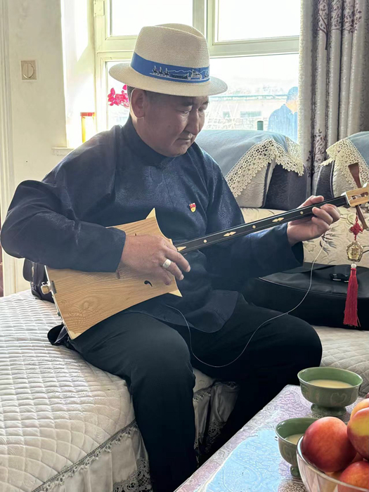 甫·巴特孟克向采訪團(tuán)展示才藝,他住的安居房在2017年精河縣6.6級(jí)地震中安然無(wú)恙。新華網(wǎng)發(fā)