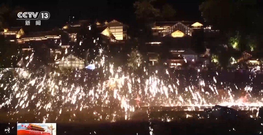 隨著夜幕降臨,非遺打鐵花、篝火狂歡派對等節(jié)目陸續(xù)開始,讓游客感受東方之美、中國之韻。10月1日到7日,烏江寨新增民族盛裝巡游、萬人大合唱、無人機(jī)光影秀等內(nèi)容,從早到晚輪番上演,為游客們呈上一場文化大餐。