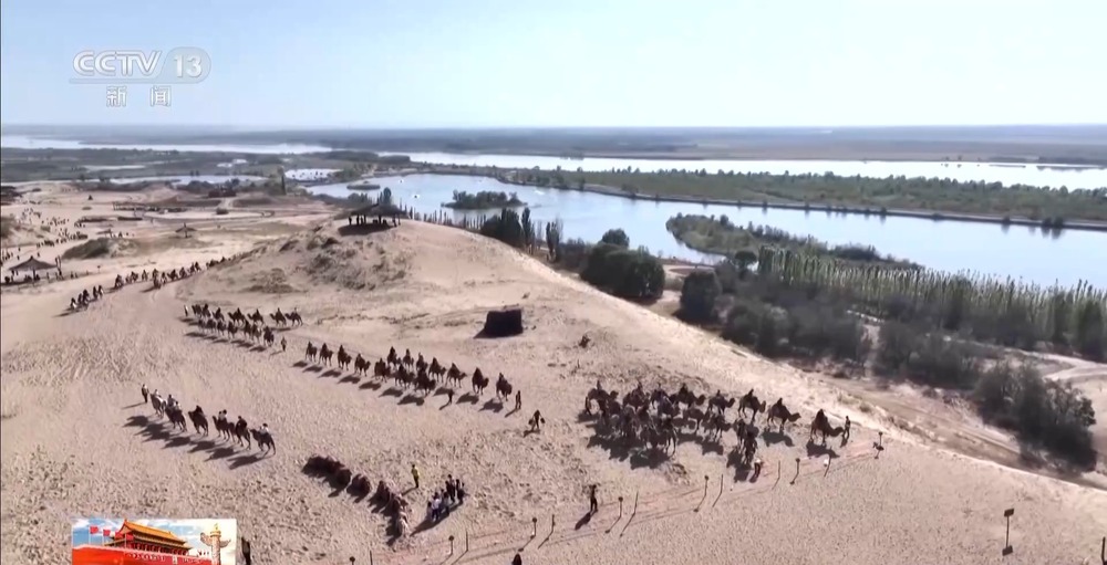 總臺(tái)記者 朱達(dá):寧夏銀川市黃沙古渡景區(qū)以一處千年古渡命名,匯集了黃河、沙漠、湖泊、濕地和田園等多種自然風(fēng)光。十一期間全國各地的游客來到黃沙古渡, 一方面可以欣賞大漠風(fēng)光、感受黃河文化 ,另一方面可以體驗(yàn)騎駱駝、沙漠沖浪和飛索等多種項(xiàng)目。