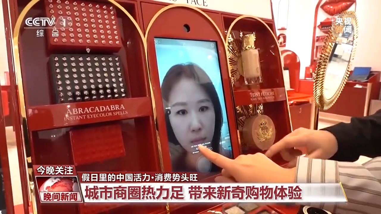 在四川成都,一家大型商場(chǎng)的裸眼3D大屏換上了國(guó)慶新裝,身臨其境的原始森林、被滿天繁星包裹,吸引了許多游客前來(lái)打卡。現(xiàn)場(chǎng)更有虛擬試妝、虛擬試鞋、智能導(dǎo)購(gòu)等等前沿科技帶來(lái)的新奇購(gòu)物體驗(yàn)。