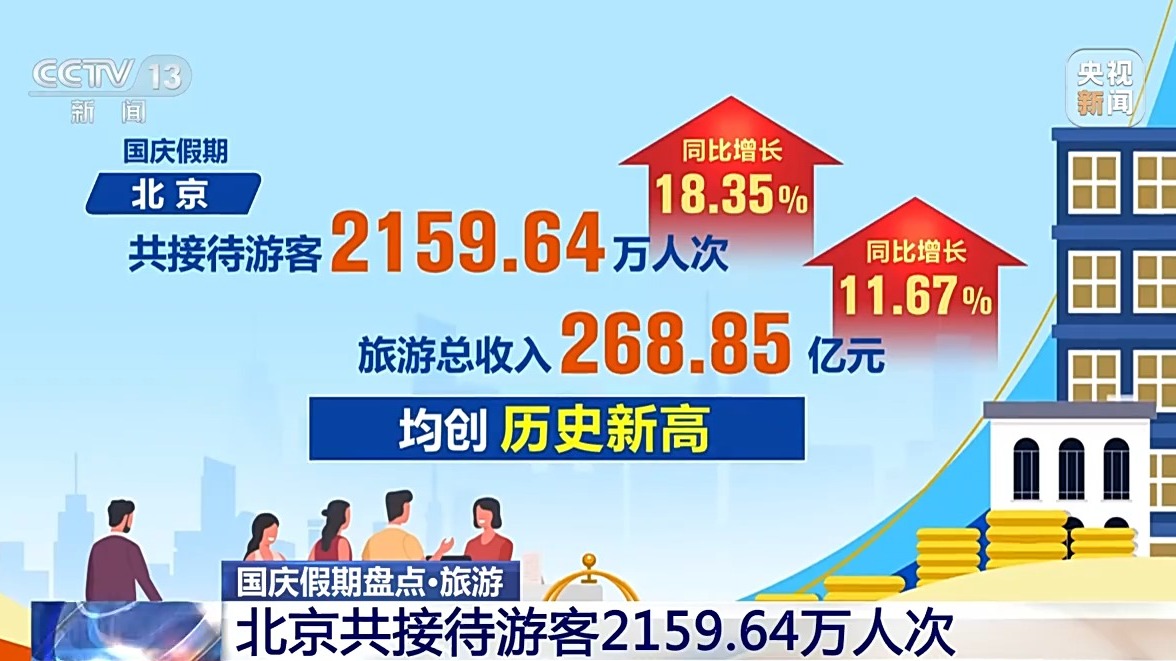 統(tǒng)計(jì)數(shù)據(jù)顯示,國(guó)慶假期,北京共接待游客2159.64萬人次,同比增長(zhǎng)18.35%;旅游總收入268.85億元,同比增長(zhǎng)11.67%,均創(chuàng)歷史新高。文博游、北京中軸線游、京郊游、微度假游、體育賽事游、特色商圈文化街區(qū)游、花燈游、網(wǎng)紅潮玩打卡地游等受到游客青睞。