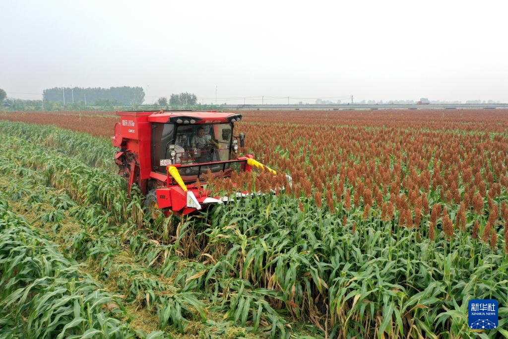 10月7日,在河北省邢臺市南和區(qū)和陽鎮(zhèn)東關(guān)村,農(nóng)民駕駛收割機收獲高粱(無人機照片)。新華社記者 王曉 攝