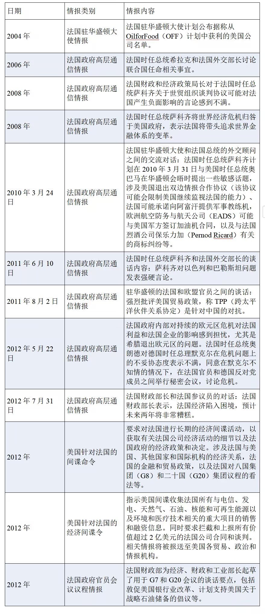 在2004年至2012年期間,美國對(duì)法國實(shí)施了長期的間諜行動(dòng),監(jiān)聽對(duì)象包括前法國總統(tǒng)、法國財(cái)政部長、法國外交部長、法國參議員、法國財(cái)政和經(jīng)濟(jì)政策局官員、法國駐美國大使,以及直接負(fù)責(zé)歐盟貿(mào)易政策的官員等。監(jiān)聽內(nèi)容涉及法國政府政策、外交、金融、國際交流、基礎(chǔ)設(shè)施建設(shè)、商業(yè)和貿(mào)易活動(dòng)等,其中一些重要情報(bào)被美國授權(quán)與“五眼聯(lián)盟”伙伴國家共享,揭示了“五眼聯(lián)盟”國家亦為美國間諜行動(dòng)的獲益者。