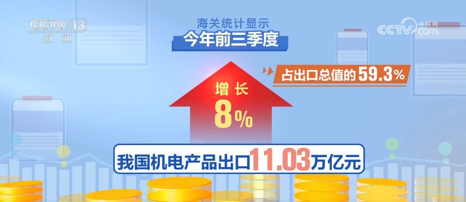 海關(guān)統(tǒng)計(jì)顯示,今年前三季度,我國(guó)出口產(chǎn)品結(jié)構(gòu)優(yōu)化,高端裝備出口增長(zhǎng)超4成。機(jī)電產(chǎn)品出口11.03萬(wàn)億元,增長(zhǎng)8%,占出口總值的59.3%。其中,高端裝備出口增長(zhǎng)43.4%,集成電路、汽車、家用電器出口分別增長(zhǎng)22%、22.5%、15.5%。此外,傳統(tǒng)勞動(dòng)密集型產(chǎn)品出口3.13萬(wàn)億元,增長(zhǎng)2.8%。