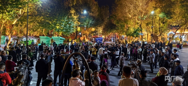 除了庫爾德寧的自然景觀,伊寧市六星街、喀贊其文化旅游區(qū)也深得旅游博主吳思瑤的青睞。夜晚的六星街,當(dāng)歡快的音樂響起,各族群眾不約而同地跳了起來,看到這一幕,吳思瑤迫不及待地沖向前:“啊,我要拍……”