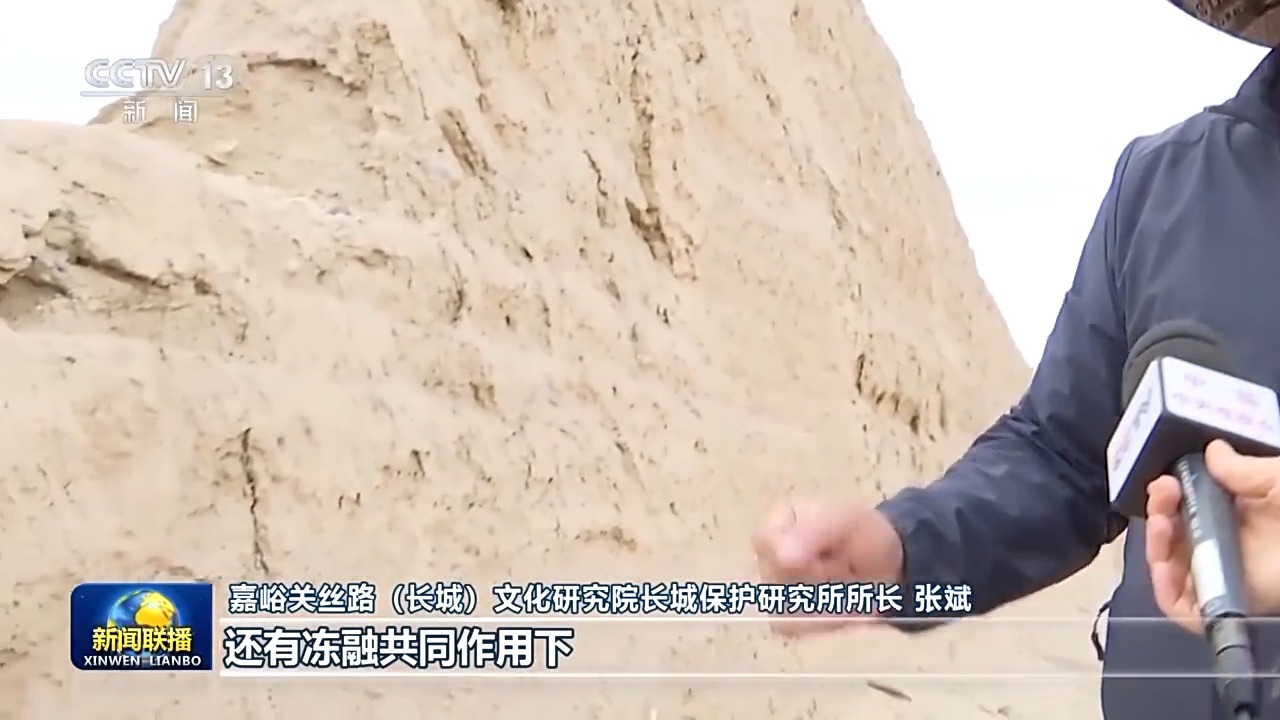 嘉峪關(guān)絲路(長城)文化研究院長城保護(hù)研究所所長 張斌:這塊就是風(fēng)雪,還有凍融共同作用下,形成一個(gè)很深的掏蝕凹槽,可能掏蝕進(jìn)去20多公分,所以我們通過對它進(jìn)行日常維護(hù),就是對它進(jìn)行夯補(bǔ),它這個(gè)墻體的穩(wěn)定性就好了。