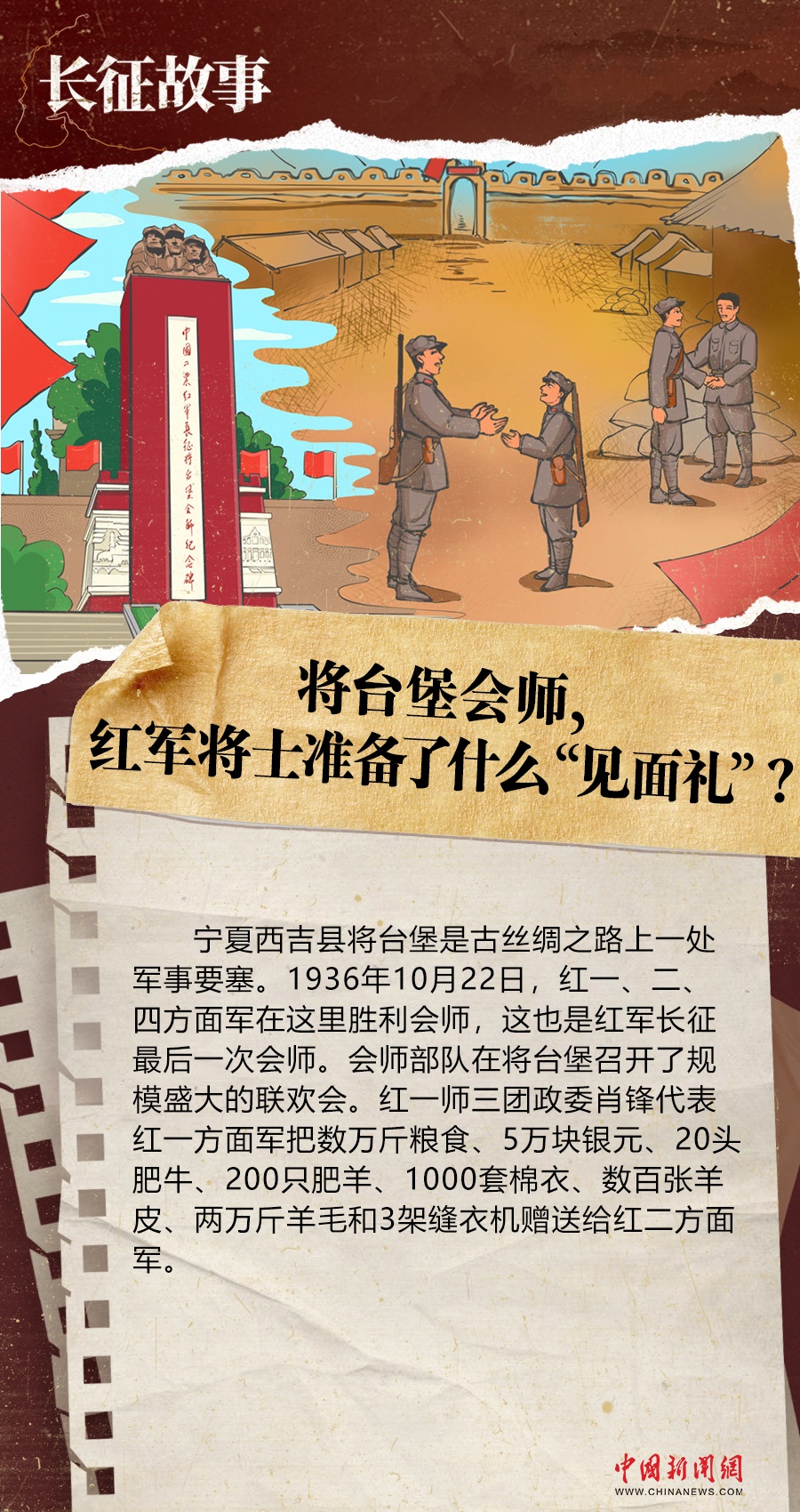 寧夏西吉縣將臺堡是古絲綢之路上一處軍事要塞。1936年10月22日,紅一、二、四方面軍在這里勝利會師,這也是紅軍長征最后一次會師。會師部隊在將臺堡召開了規(guī)模盛大的聯(lián)歡會。紅一師三團政委肖鋒代表紅一方面軍把數(shù)萬斤糧食、5萬塊銀元、20頭肥牛、200只肥羊、1000套棉衣、數(shù)百張羊皮、兩萬斤羊毛和3架縫衣機贈送給紅二方面軍。